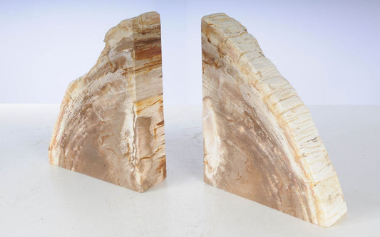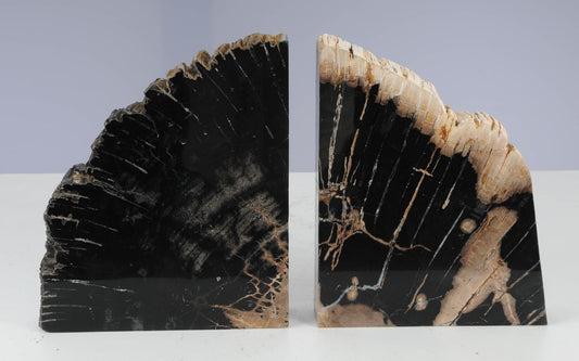 Ogni coppia di fermalibri in legno fossile è realizzata a partire da sezioni autentiche di tronchi pietrificati, e quindi presenta venature e forme uniche, inconfondibili. Alcune coppie di fermalibri di design sono simmetriche, specialmente se tagliate a libro, ma resta sempre evidente l’unicità di ogni pezzo. È proprio questa irregolarità naturale a renderli oggetti di design esclusivo, ideali per ambienti raffinati.