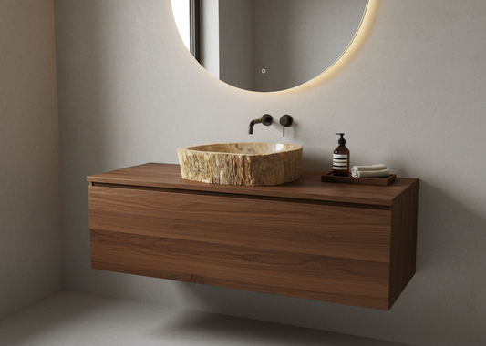 Porta in bagno un elemento di design che unisce la forza della pietra e il carattere caldo del legno. Scopri la nostra collezione di lavandini d'appoggio in legno fossile: