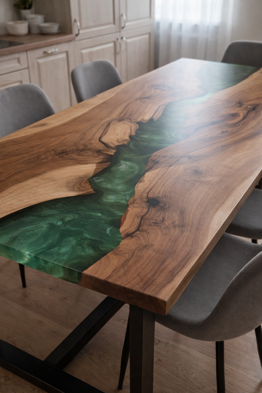 L 130cm, P 130cmPrezzo di listino €1.700,00 EURPrezzo di listinoPrezzo unitario / perPrezzo scontato €1.700,00 EURTavolo da Pranzo Grace in Noce Europeo Massello e Resina Verde Epossidica Satinata