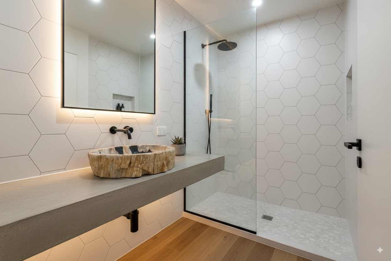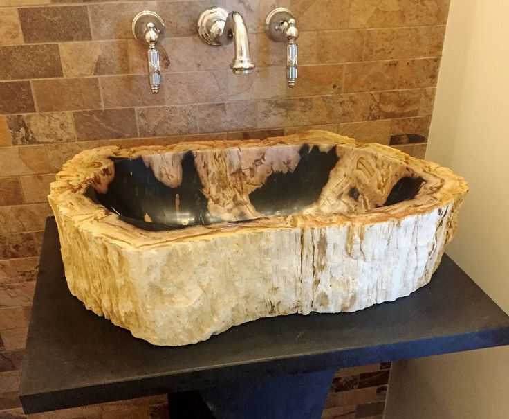 Idee d’arredo per valorizzare il tuo bagno, spa o ambiente benessere con un lavandino in legno pietrificato. Immagini illustrative per ispirare soluzioni di design uniche