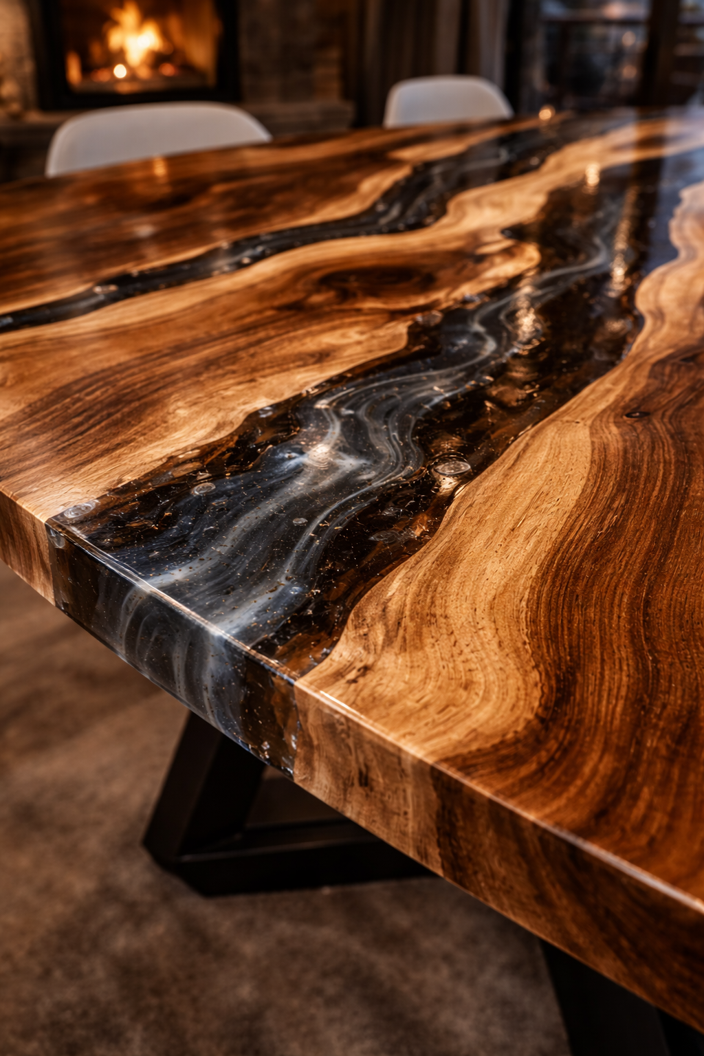Minimal al millimetro. Piano in legno massello abbinato a resina nera fumè — nessun riflesso, nessuna distrazione. Il legno emerge dal nero come un rilievo, ogni venatura diventa scultura. Larghezza ridotta a 70 cm: un tavolo da pranzo lineare, adatto a sale lunghe o cucine open-space. 6 posti. Ogni tavolo in legno e resina è irripetibile. Realizzato a mano in Italia da Esotika. Preventivo su misura su WhatsApp.